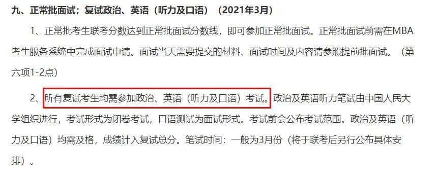 所有復試考生均需參加政治、英語(聽力及口語)考試。政治及英語聽力筆試由中國人民大學組織進行,考試形式為閉卷考試,口語測試為面試形式。考試前會公布考試范圍。政治及英語(聽力及口語)均需及格,成績計入復試總分。筆試時間:一般為3月份(將于聯考后另行公布具體安排)。