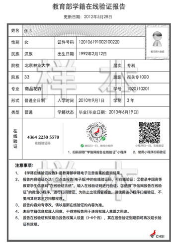 非應(yīng)屆生考生未通過(guò)學(xué)歷校驗(yàn)的必須上傳《教育部學(xué)歷證書(shū)電子注冊(cè)備案表》或《中國(guó)高等教育學(xué)歷認(rèn)證報(bào)告》或《國(guó)外學(xué)歷學(xué)位認(rèn)證書(shū)》(三者之一均可)的圖片1張;其中,如果是尚未取得本科畢業(yè)證書(shū)的自考考生和網(wǎng)絡(luò)教育考生,僅需上傳成績(jī)單或?qū)W生證(兩者或兩者之一均可)。樣稿如下:
