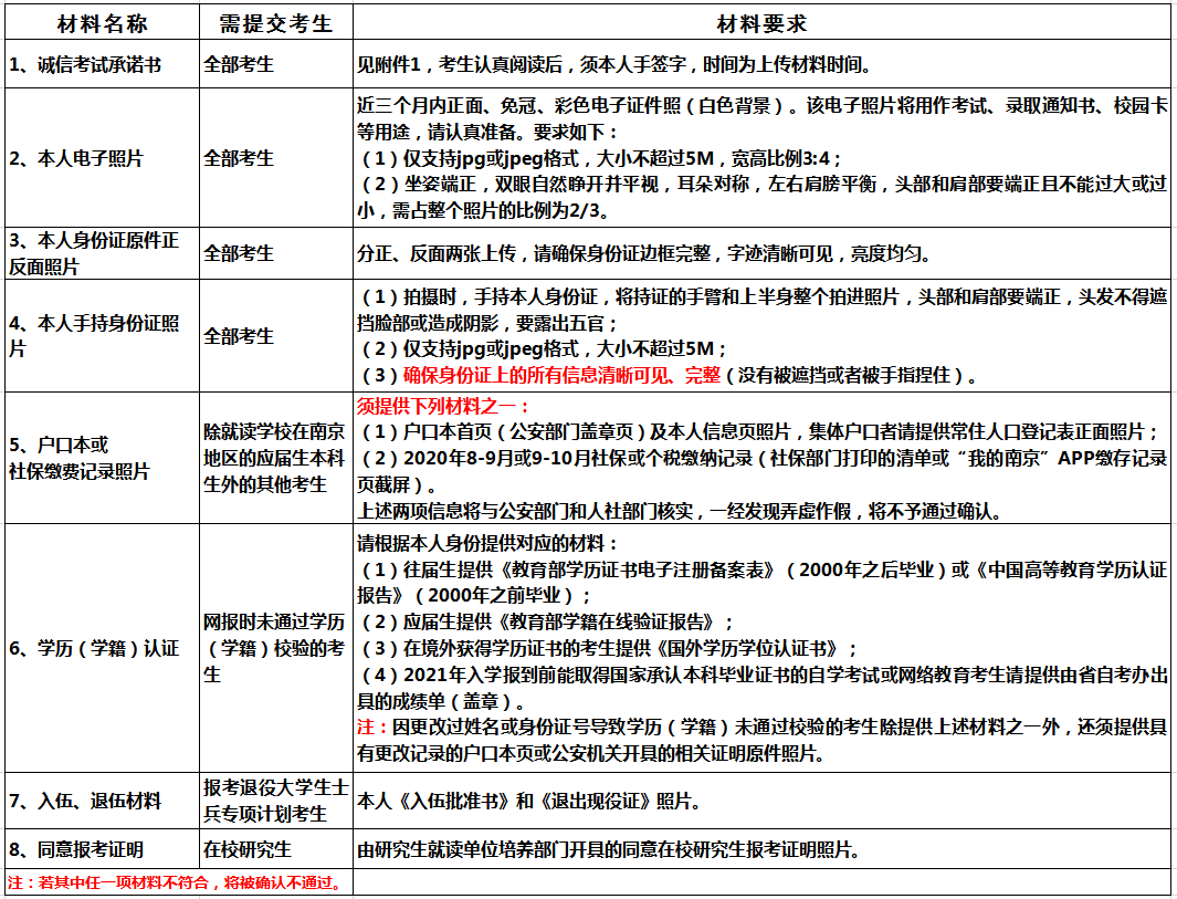 上述考生須按照我報考點要求提供各項材料(見表1),若其中任一項材料不符合,將被確認不通過。請不符合我報考點接收范圍的考生在10月31日前修改報名,選擇正確的報考點,否則造成網上審核不通過、無法考試等后果,責任由考生本人承擔。