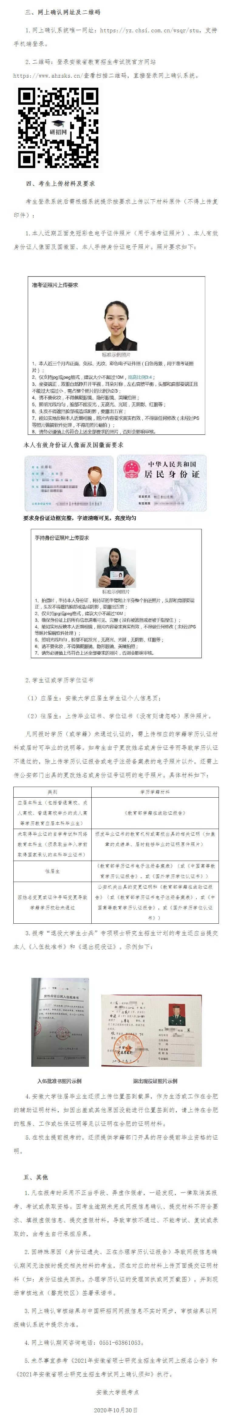 今年安徽大學報考點實行網上確認報名信息,確認期間將在網上審核考生上傳的材料并通過系統向考生反饋審核結果。請所有考生務必仔細閱讀此公告要求,及時查看審核結果,并按要求在規定時間內補充(修改)有關材料。未在規定時間進行網上確認以及未被審核通過的考生,報名信息無效,將不得參加考試。