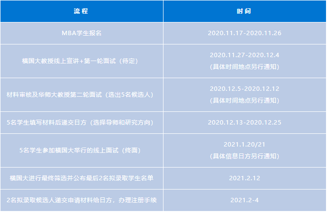 a) 本次雙學位項目名額有限,華東師范大學MBA項目2020級及2019級在讀學生均可報名。工作組將根據報名情況開展材料審核、面試和錄取工作,選拔時間安排如下:
