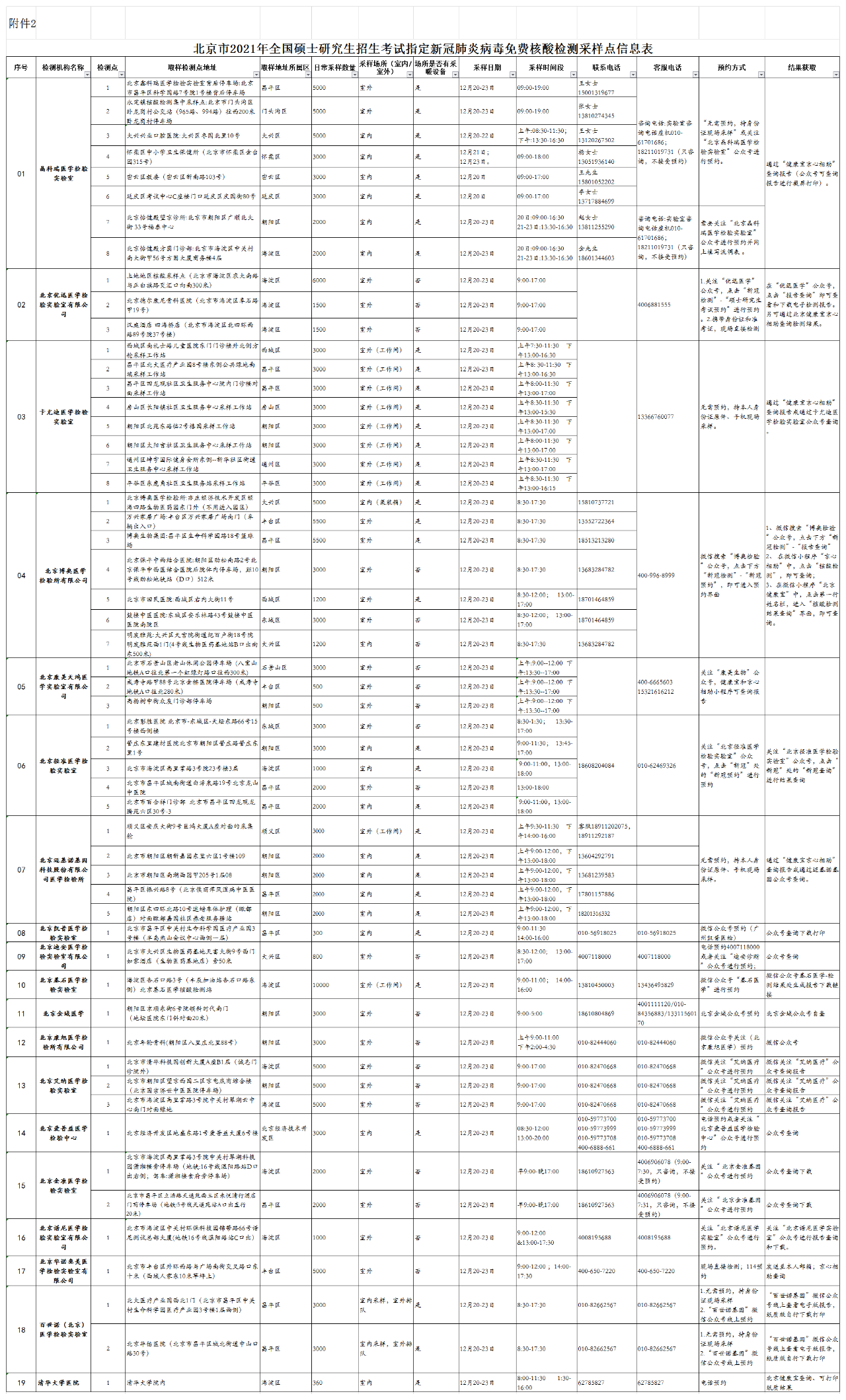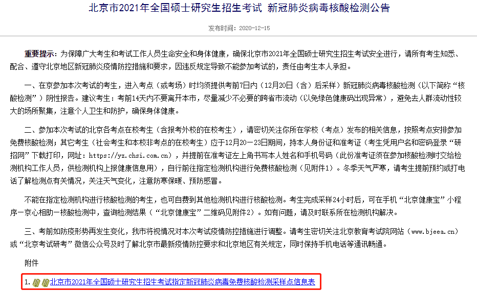 導(dǎo)讀:12月15日,北京教育考試院發(fā)布《北京市2021年全國(guó)碩士研究生招生考試 新冠肺炎病毒核酸檢測(cè)公告》,在《公告》的附件里,公布了北京免費(fèi)核酸檢測(cè)制定機(jī)構(gòu)名單。