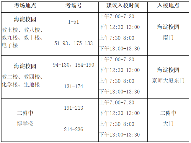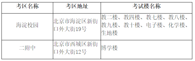 我校設置北京師范大學海淀校園(以下簡稱海淀校園)和北京師范大學第二附屬中學(以下簡稱二附中)兩個考區,共10個考試樓,詳情如下(各考試樓位置示意圖見附件1、2):