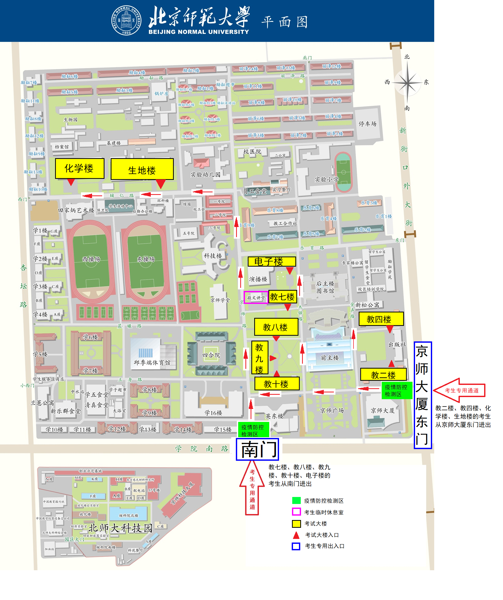 (3)體溫檢測,準考證、身份證查驗,核酸檢測陰性報告驗證,綠色健康碼核查環節將需要一定時間,請考生務必預留充足時間提前到達考點,有序排隊,并聽從現場工作人員引導與指揮。海淀校園南門、京師大廈東門至最遠考試樓步行時間約為15分鐘。