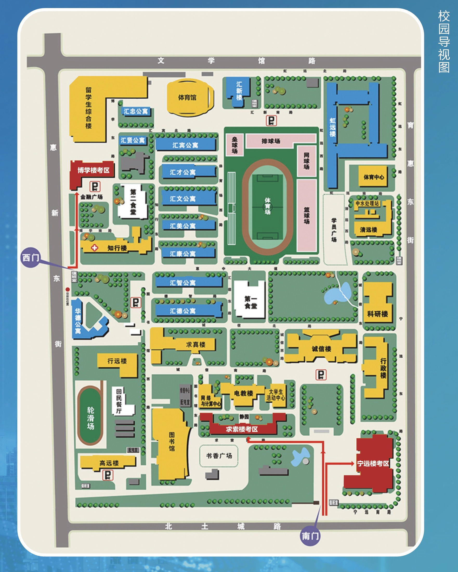 考生進(jìn)入校園后,請(qǐng)按路線圖和指示標(biāo)志直接前往所在考區(qū)考場,不要在其他區(qū)域活動(dòng)或逗留,以免錯(cuò)過入場時(shí)間。