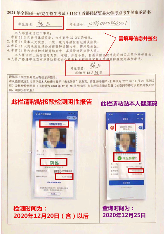 2.個(gè)人健康監(jiān)測(cè)。從考前14天起,考生須每日進(jìn)行自我健康監(jiān)測(cè)。監(jiān)測(cè)期間如有異常(如出現(xiàn)發(fā)熱(體溫≥37.3℃)、乏力、干咳、腹瀉等相關(guān)癥狀),必須即刻與本考點(diǎn)聯(lián)系并及時(shí)就醫(yī)。聯(lián)系方式:郵件發(fā)送情況說(shuō)明至yanzhaoban@cueb.edu.cn,郵件主題:姓名+準(zhǔn)考證號(hào)+健康異常狀況監(jiān)測(cè)報(bào)告。凡隱瞞或謊報(bào)本人健康狀態(tài)的考生,將根據(jù)有關(guān)規(guī)定進(jìn)行處理。監(jiān)測(cè)期間各項(xiàng)數(shù)據(jù)正常的考生,請(qǐng)下載并填寫(xiě)《2021年全國(guó)碩士研究生招生考試首都經(jīng)濟(jì)貿(mào)易大學(xué)考點(diǎn)考生健康承諾書(shū)》(點(diǎn)擊下載)。并將2020年12月20日(含)以后的核酸檢測(cè)陰性報(bào)告及2020年12月25日(含)以后的健康寶“未見(jiàn)異常”顯示頁(yè)打印并粘貼在承諾書(shū)指定位置(注:核酸檢測(cè)報(bào)告可以通過(guò)“健康寶-京心相助-核酸檢測(cè)”欄目查詢(xún)后截屏下載打印,也可通過(guò)各檢測(cè)機(jī)構(gòu)發(fā)布的查詢(xún)通道下載打印,如下圖)。