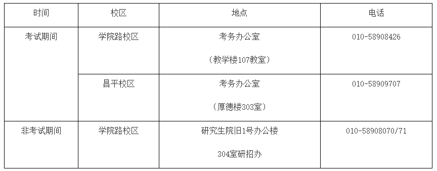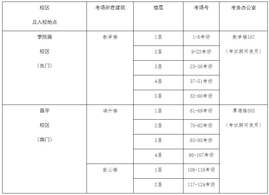 我考點(diǎn)考場分布在學(xué)院路校區(qū)教學(xué)樓及昌平校區(qū)端升樓、致公樓(具體分布見表1)。