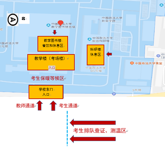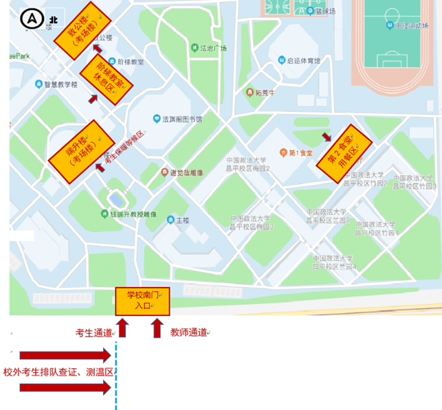 學(xué)院路校區(qū)開放東門為考生提供入場通道(詳見圖1);昌平校區(qū)只開放南門為考生提供入場通道(詳見圖2)。(注意:校園其他校門考生無法通行)