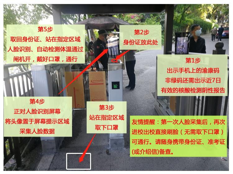 (二)校外考生于12月25日14:00—20:00抵達學校,辦理進校手續、注冊校園門禁系統并熟悉考場??忌谥付ㄐiT(一號門、二號門、三號門、五號門、六號門均可)辦理進校手續以及注冊校園門禁系統人臉識別權限,注冊成功后,考生在考試期間可在通過人臉識別和體溫檢測后,從任一校門進出校園。已注冊校園門禁系統的本校應屆考生無需辦理。