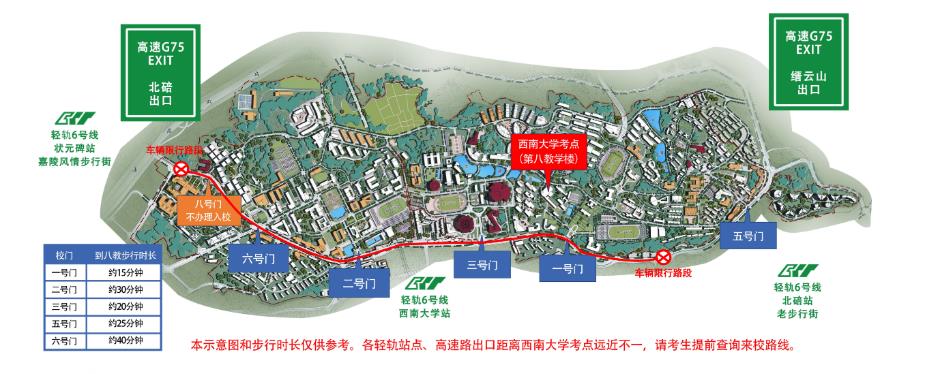 由于北碚區路網改造,西南大學校外主干道實行車輛限行,限行路段僅允許公共交通車輛、周邊單位(居民)車輛駛入,其余車輛駛入將受到交通違章處罰,且限行路段因道路變窄非常擁堵,故建議考生乘坐輕軌、公交車等公共交通工具前往考點。確需駕車前往考點的,建議走G75高速縉云山出口下道行至西南大學五號門即停即走(擁堵慎選),或走北碚出口下道行至嘉陵風情步行街停車,換乘輕軌至西南大學站,步行前往考點。
