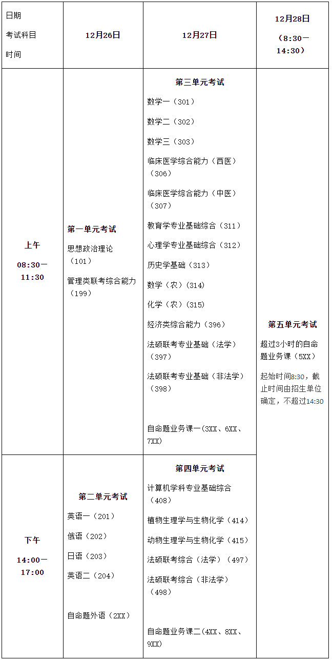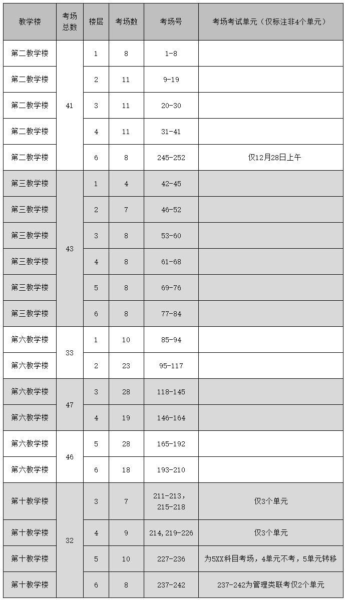 12月28日5XX科目考場(即之前三個單元為227-236的10個考場),將轉移至二教6樓教室進行,考場號改為245-252,考試時間為8:30—14:30(具體時間以招生單位規定的為準)。