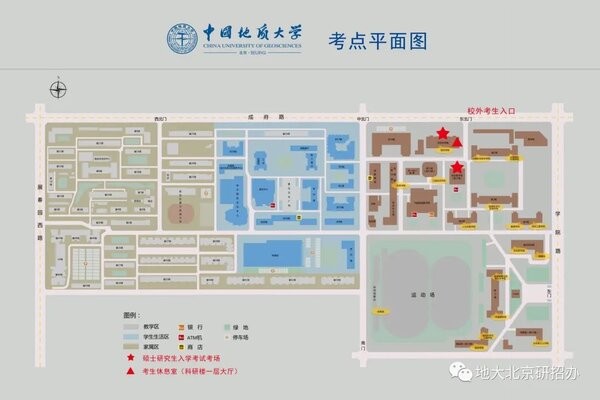 1、校外考生應于考試當日從我校東北門進入(早7:00、下午12:30可以進入),考生考試考場分布在綜合教學樓和科研樓,請同學們及時查看個人考場安排(考生考場安排將于考前一天在本公眾號和中國地質大學(北京)研究生院官網公布),有序進入相應考場。