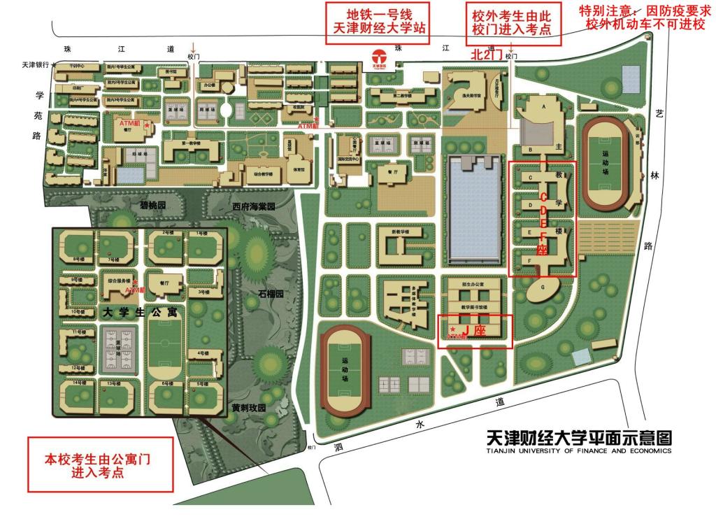 2.我校考試地點集中在C座、D座、E座、F座、J座,本校應屆考生可從公寓校門進入校區,校外人員統一從北二門(珠江道長湖路交口)進入校區,因防疫要求校外車輛不可進校,推薦大家搭乘地鐵公交車或出租等交通工具。