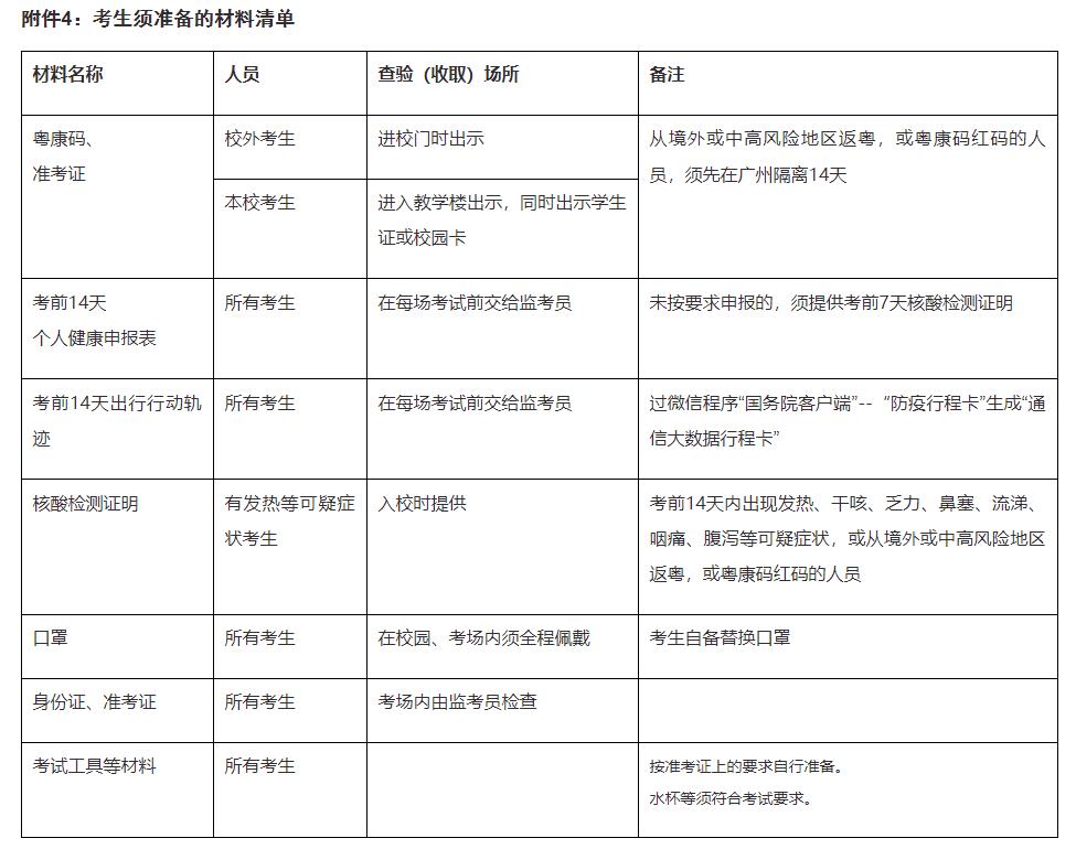 5.考前14天內(不含考試當天)出現發熱、干咳、乏力、鼻塞、流涕、咽痛、腹瀉等可疑癥狀(以下簡稱可疑癥狀)、有境外或中高風險地區活動軌跡、或“粵康碼”為紅碼的考生還須提供考前7天核酸檢測陰性證明。