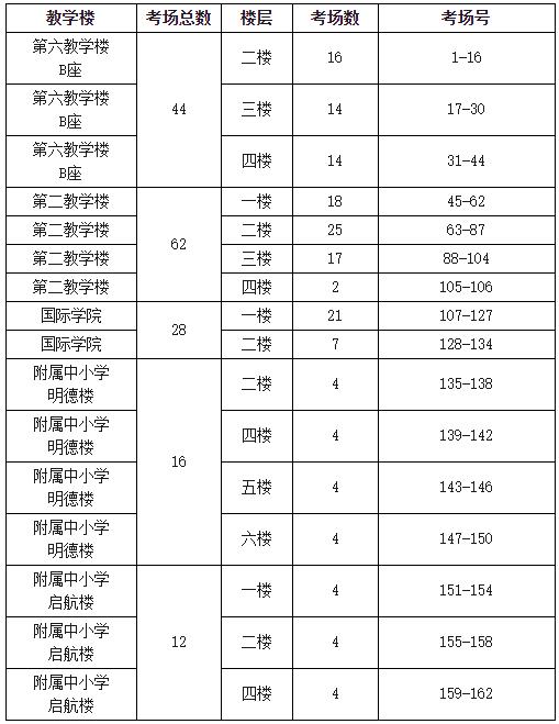本考點分為第六教學樓B座和第二教學樓、國際學院、附屬中小學三個考區,分別對應不同校門,請考生按以下指引進入考點: