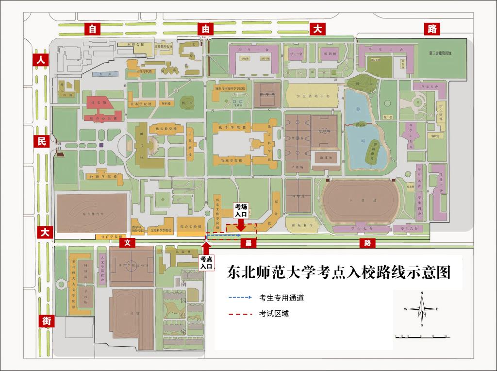單獨考試考場位于吉林省長春市南關區人民大街5268號東北師范大學本部校區研究生教學樓。考生應嚴格按照《東北師范大學考點入校路線示意圖》(附件1)標注的入校路線,從位于文昌路南門的專用通道(此通道為人行通道,禁止車輛入內)進入我校,不得跨越隔離帶進入校園其他非考試區域。