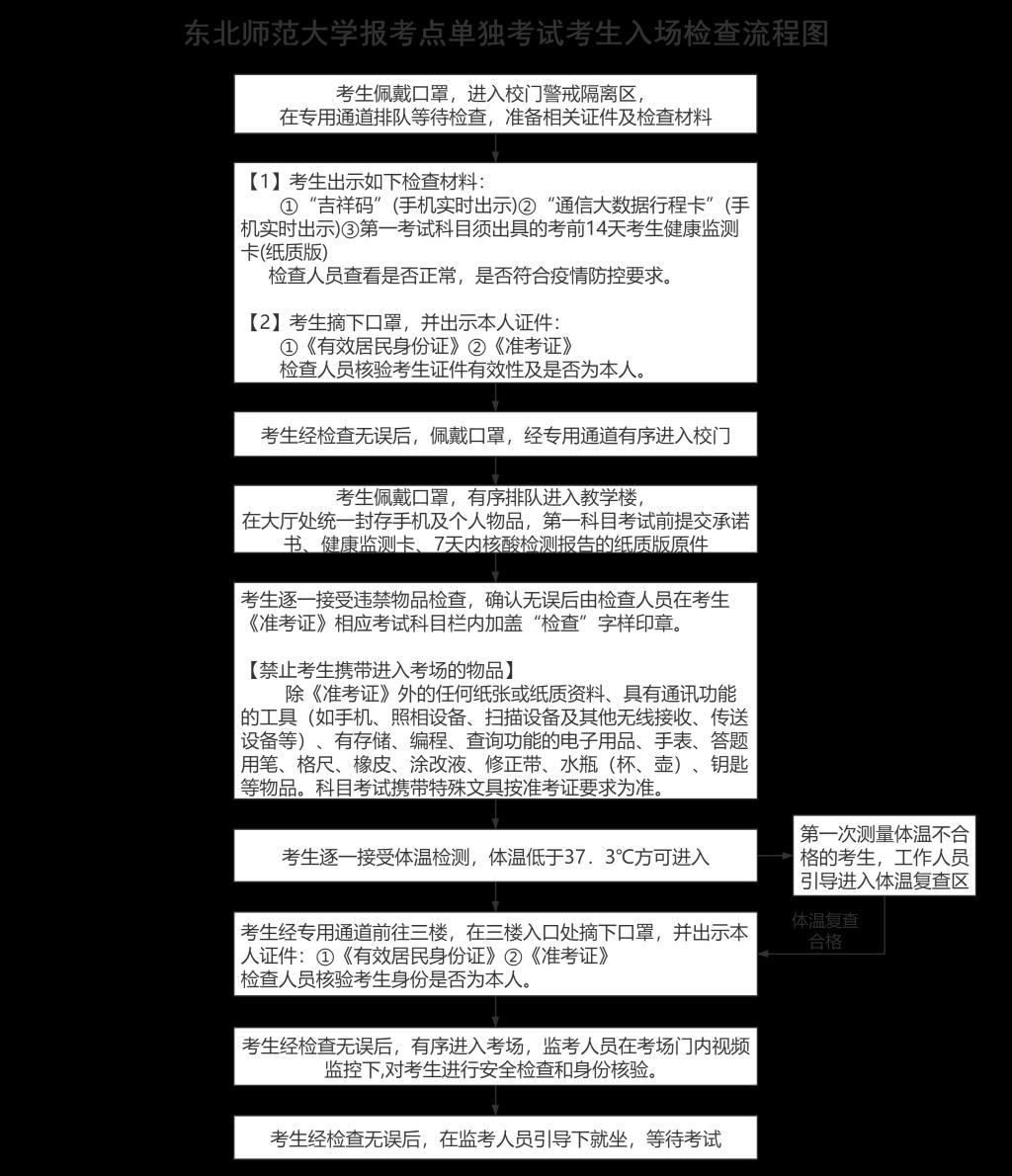 2.入場檢查流程:考生熟悉考場前和每科目開考前,須配合工作人員安排,按照《東北師范大學報考點單獨考試考生入場檢查流程圖》(附件2)積極主動接受入場檢查。