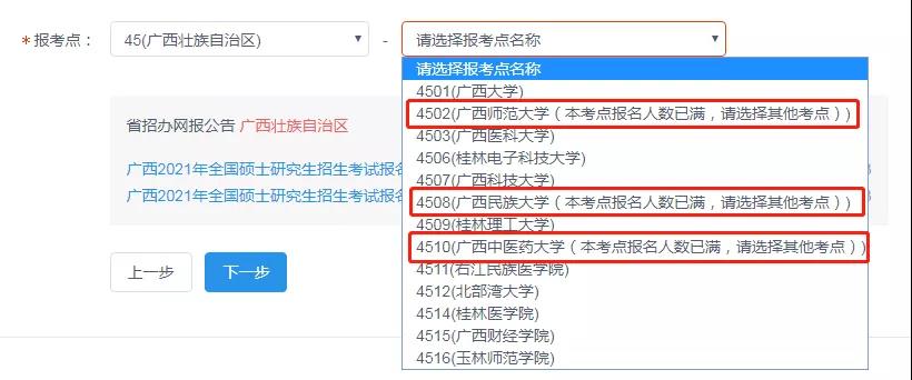 廣西在第一天報名就已經有三個報考點人數已滿,分別是廣西師范大學、廣西民族大學以及廣西中醫藥大學報考點。