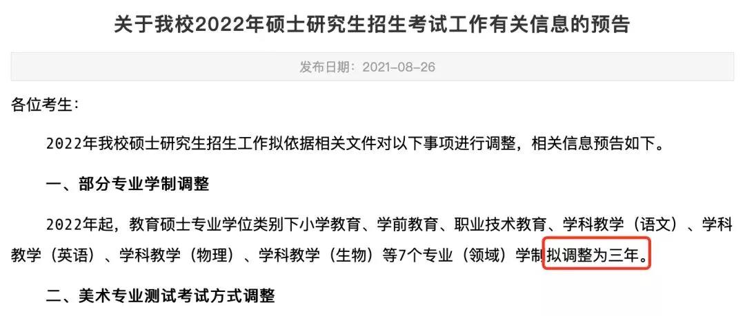 8月26日,河北師范大學發布通知:2022年起,教育碩士專業學位類別下小學教育、學前教育、職業技術教育等7個專業(領域)學制擬調整為三年。