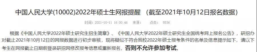 例如,中國人民大學(xué)研招辦近期發(fā)布《2022年碩士生網(wǎng)報提醒》,通知有部分考生報名不符合條件,考生如未在網(wǎng)報結(jié)束(10月25日22:00)前修改報考信息或重新報名,則不允許參加考試。