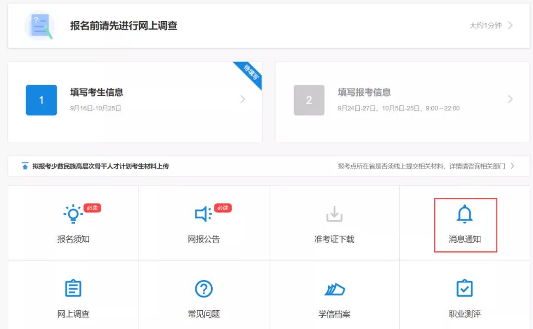 消息通知主要是報考點或招生單位發(fā)送的招考網(wǎng)報信息,考生登錄網(wǎng)報平臺,查看消息通知即可!如果沒有收到消息,說明報考點或招生單位沒有新的網(wǎng)報消息通知,考生不必驚慌。