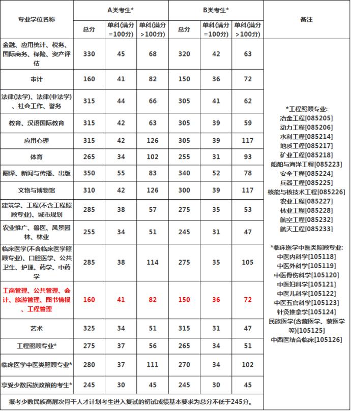 2014年碩士研究生招生復試資格基本線已公布,其中工商管理、公共管理、會計A線為:160/82/41,B線為150/72/36。具體如下: