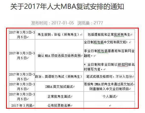 2月底和3月初,自主劃線院校將陸續(xù)公布分?jǐn)?shù)線;這些院校的復(fù)試也會開始得很早,將在3月初進(jìn)行。中國人民大學(xué)商學(xué)院已經(jīng)公布了2017年MBA復(fù)試通知,復(fù)試時間是3月3日-5日,小編推測國內(nèi)其他33所自主劃線院校的復(fù)試時間也會在這一階段進(jìn)行。