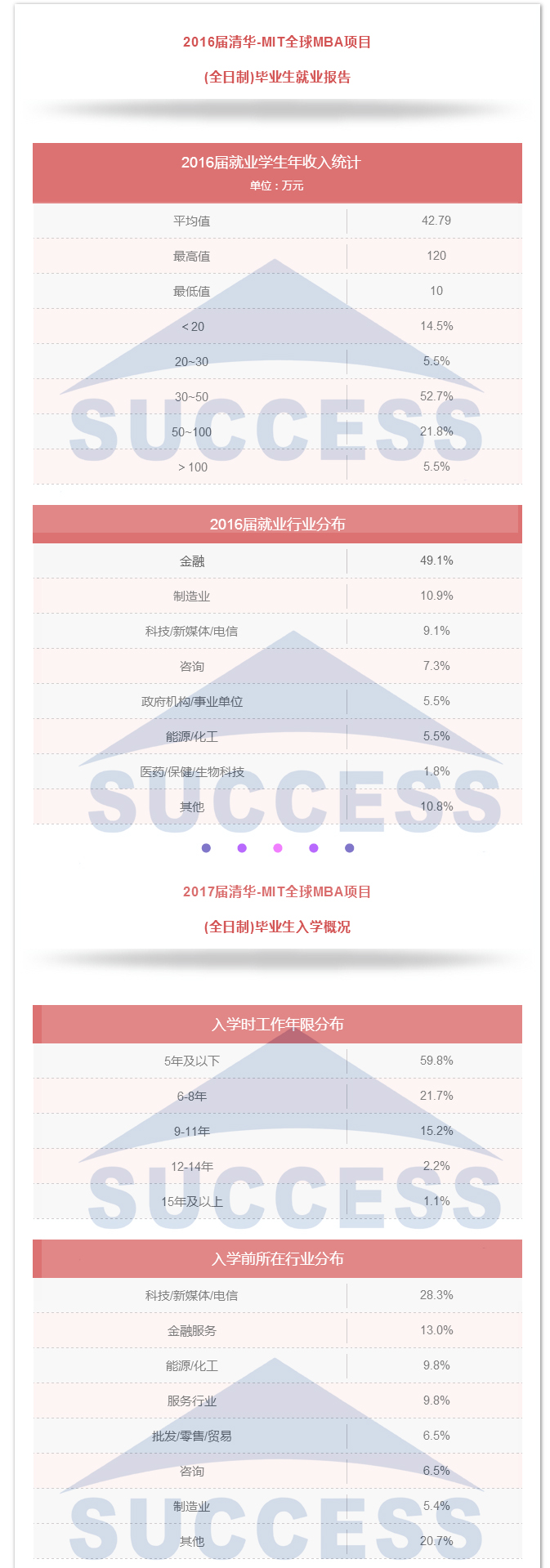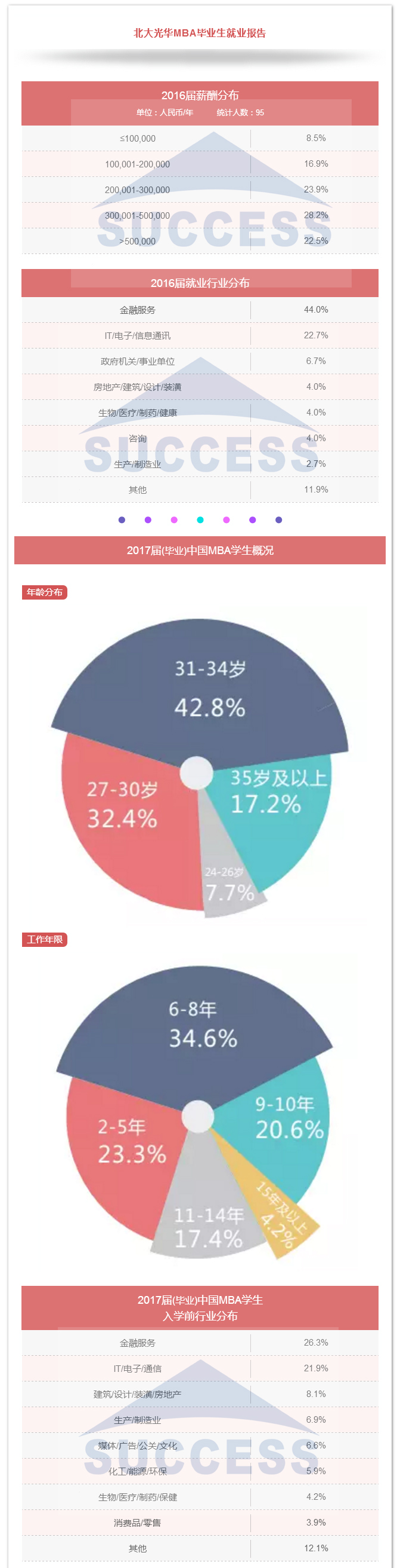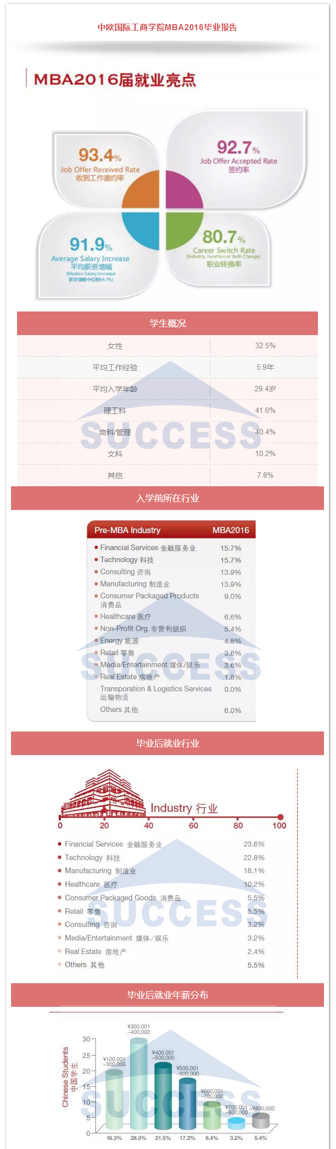 每位決定讀mba的同學(xué)或許都有這樣的疑問: ??? 商學(xué)院招收學(xué)生的平均年齡是多少? 35歲在同學(xué)中會(huì)偏大嗎? 工科男,一直在技術(shù)崗,考取希望大嗎? 工作年限短,管理經(jīng)驗(yàn)薄弱,面試能過嗎? 傳統(tǒng)行業(yè)轉(zhuǎn)金融,有機(jī)會(huì)嗎? 畢業(yè)后年薪能達(dá)到多少? ... ... 這些問題大家或多或少都會(huì)存在,那商學(xué)院學(xué)生來源和畢業(yè)之后的發(fā)展到底是怎樣,小編整理了以下四所院校的就業(yè)報(bào)告,帶大家解開疑團(tuán)。 結(jié)論 名校MBA學(xué)生越來越年輕化,年齡大不會(huì)成為優(yōu)勢(shì),反而帶來兩個(gè)后果,一個(gè)是提高了老師對(duì)你的預(yù)期,即認(rèn)為較長(zhǎng)的工作時(shí)間應(yīng)該有較高的職位和豐富的管理經(jīng)驗(yàn),二是讀MBA后收益時(shí)間短,不容易有突破。 MBA是實(shí)現(xiàn)薪資增幅和職業(yè)轉(zhuǎn)換最便捷高效的途徑,是成為金領(lǐng)的必經(jīng)之路。 選擇SUCCESS,選擇成功!