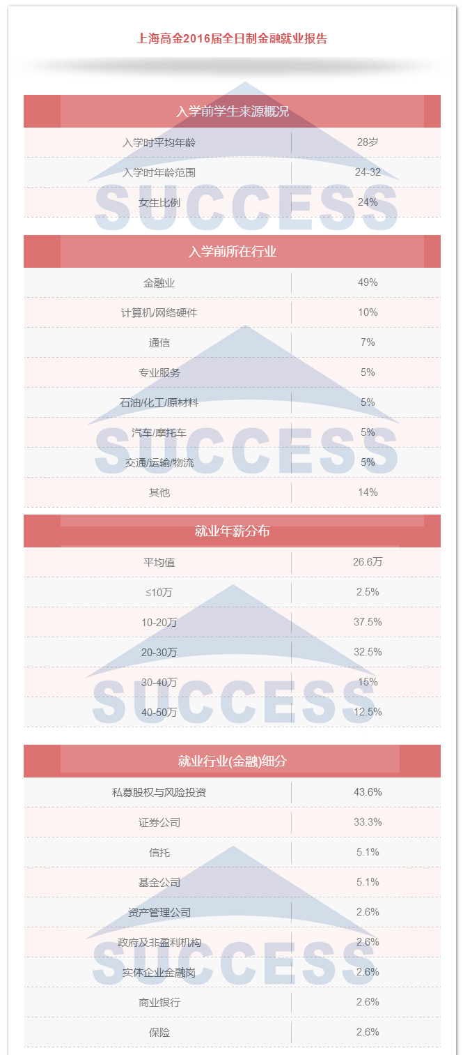 通過上海高金2016屆全日制金融就業(yè)報(bào)告,入學(xué)平均年齡28歲,畢業(yè)后進(jìn)入私募及證券公司高達(dá)77%。