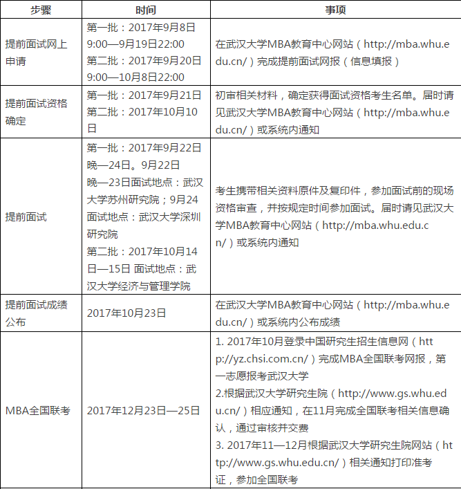 考生可于2017年9月8日9:00—10月8日22:00登錄MBA教育中心網站,完整填寫申請表并提交相關電子材料,申請參加提前面試。具體要求及流程安排請見《武漢大學2018年MBA提前面試申請相關說明》。
