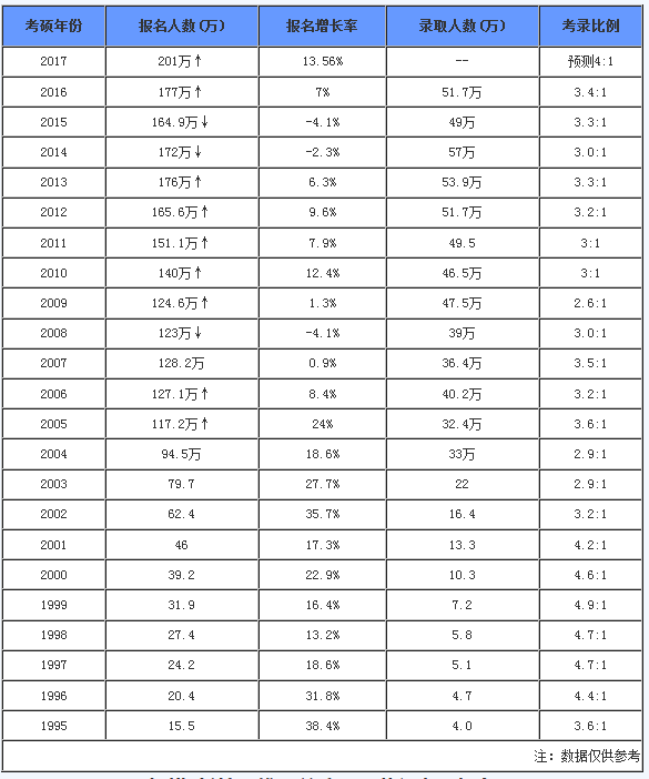 近23年考研整體報錄比統計表一覽(1995—2017)