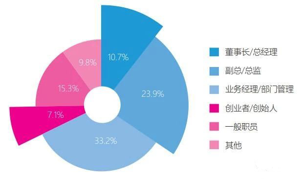 由上圖可知,項目人員分董事長/總經理、副總/總監、業務經理/部門經理、創業者/創始人、一般職員、其他共六個級別,其中業務經理/部門經理報考人數較多,占比33.2%;副總/總監級別排第二位,占比23.9%;一般職員列第三,占比15.3%。