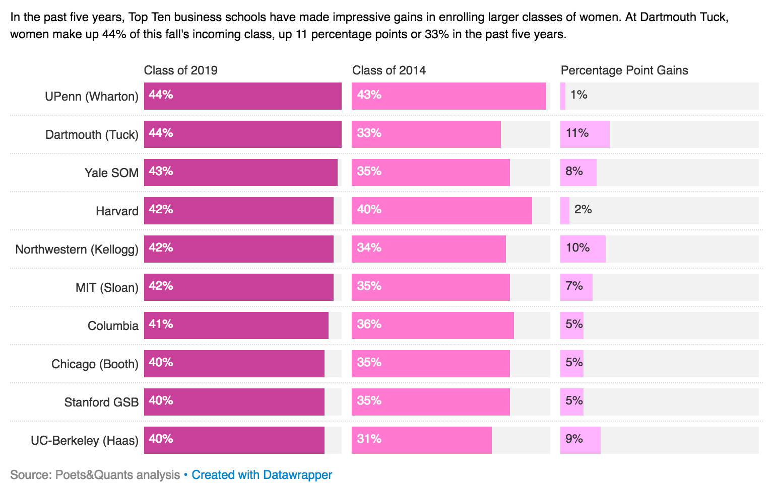 Forté基金會的數據也顯示,很多商學院在鼓勵女性參加MBA課程方面已經取得了很大的進展。例如,在過去的五年里,每一個排名前十的MBA專業都在夸耀他們課堂上的女性比以往任何時候都多。在達特茅斯大學塔克商學院,女性在2017年的入學學生中占44%,比2014年的33%上升了11個百分點。西北大學的凱洛格商學院在一位女性院長的領導下,在同一時間段內將女性入學人數增加了10個百分點,從34%增加到42%(見下表)。