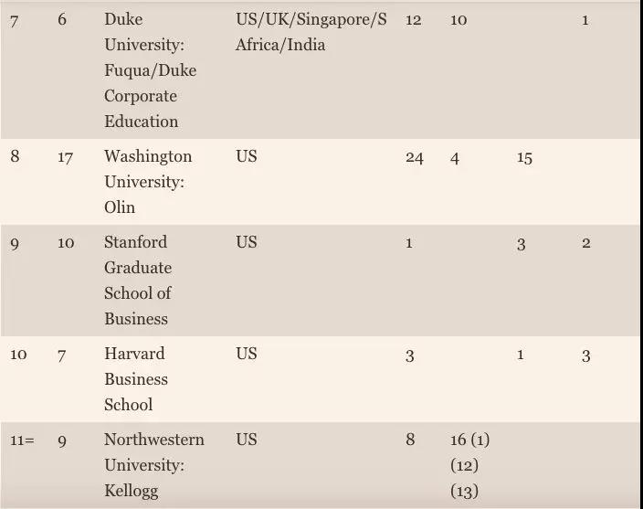 英國《金融時報》在1999年發布其第一個MBA排名,包括全球前50個項目,但沒有一所亞洲的商學院。今年中國有12所商學院入選榜單,其中7所來自中國大陸地區。MBA排名中排名第一的商學院是中歐國際工商學院,而印度商學院代表印度的高校第一次出現在MBA的排名。