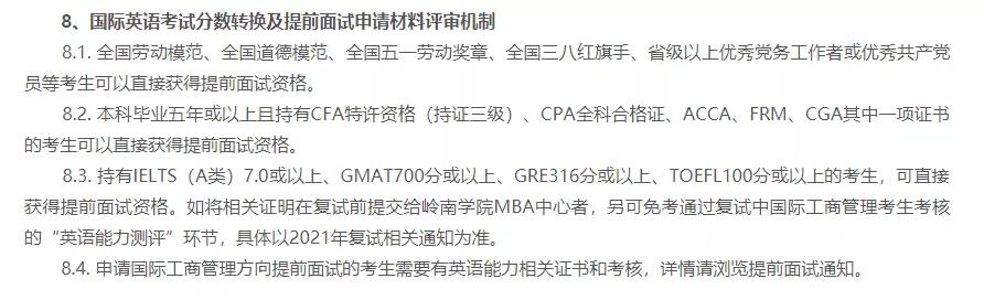 8.3. 持有IELTS(A類)7.0或以上、GMAT700分或以上、GRE316分或以上、TOEFL100分或以上的考生,可直接獲得提前面試資格。如將相關證明在復試前提交給嶺南學院MBA中心者,另可免考通過復試中國際工商管理考生考核的“英語能力測評”環節,具體以2021年復試相關通知為準。