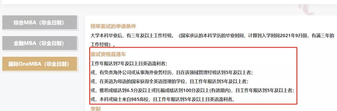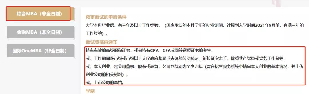持有有效的高級職稱證書,或者持有CPA、CFA或同等資質證書的考生;或,工作期間獲市級或市級以上人民政府獎勵或表彰的勞動模范、新長征突擊手、優秀共產黨員或黨務工作者等;或,本人創業,是公司董事、股東或高管,公司存續期為至少四年(需在招生服務系統中填寫本人創業的基本情況,并上傳創業公司的相關材料);或,上市公司的高管。