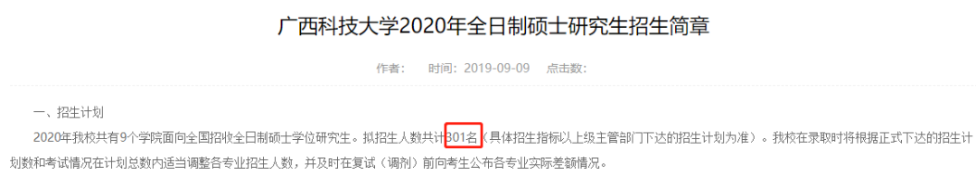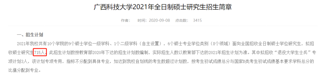 廣西科技大學9月9日發布招生簡章,2021年擬招收碩士研究生715人,與2020年擬招生人數共計301名相比,今年擴招414人。