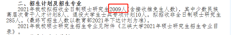 三峽大學7月20日公布2021年碩士研究生招生簡章:擬招碩士生2009人,與2020年碩士招生計劃1265人相比,計劃擴招744人,增幅近59%。