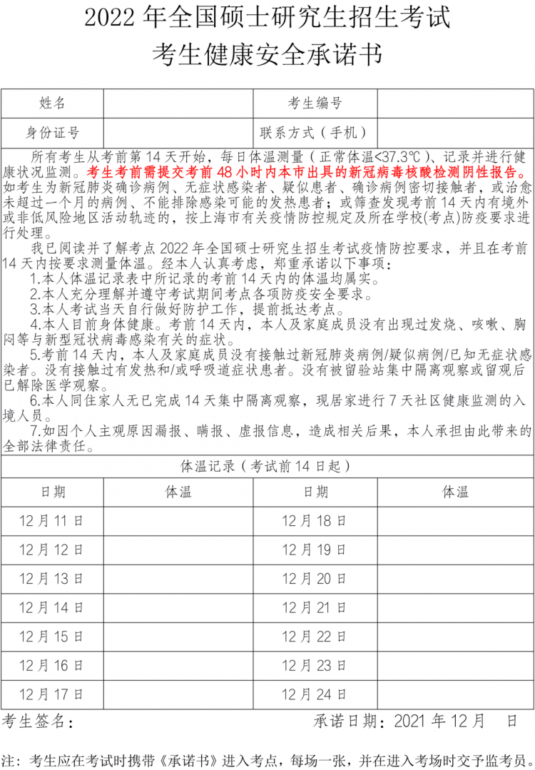 請考生在“上海招考熱線”網站(www.shmeea.edu.cn)重新下載打印新版《2022年全國碩士研究生招生考試考生健康安全承諾書》,并如實填報。