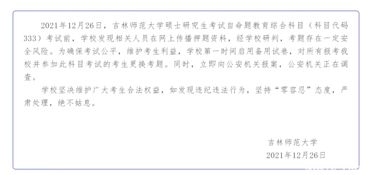 考研作弊年年有,今年來了泄題。2021年12月26日,吉林師范大學(xué)碩士研究生考試自命題教育綜合科目(科目代碼333)考試前,學(xué)校發(fā)現(xiàn)相關(guān)人員在網(wǎng)上傳播押題資料,經(jīng)學(xué)校研判,考題存在一定安全風(fēng)險(xiǎn)。