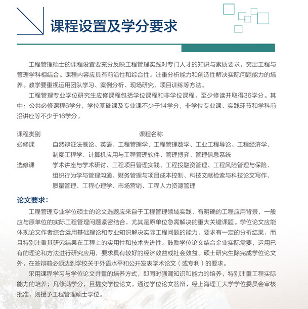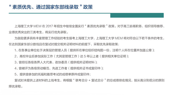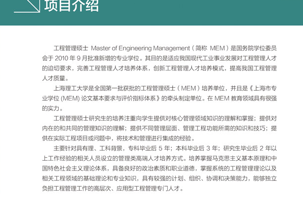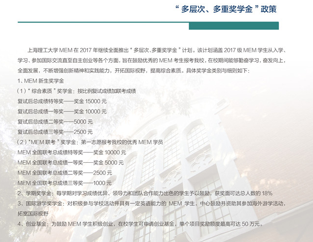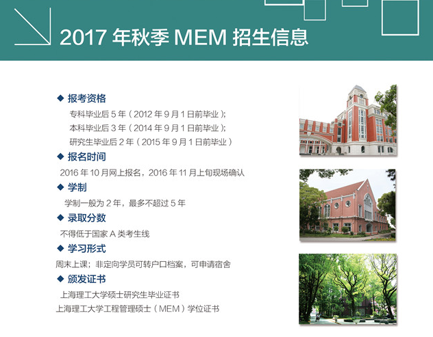導讀:上海理工大學2017年工程管理碩士(MEM)招生簡章已經公布了,上海理工大學2017年工程管理碩士(MEM)的學費為7 8萬元,具體內容如下所示: