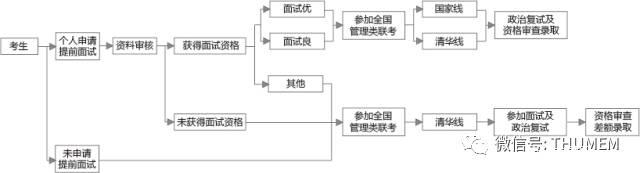 根據申請流程,面試分為提前面試(提前批)和通過全國聯考并達到清華線后的面試(報考批)。提前批面試報名及申請材料通過官方面試報名網址:www.tsinghua-mem.cn申請;報考批面試設置在全國聯考后,無需單獨申請。