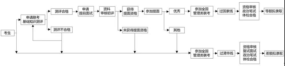 未最終在提前面試中獲得結果“優秀”的所有其他類考生(含未申請提前面試考生)也可直接參加全國管理類聯考,在聯考中通過“清華線”可獲得復試資格。