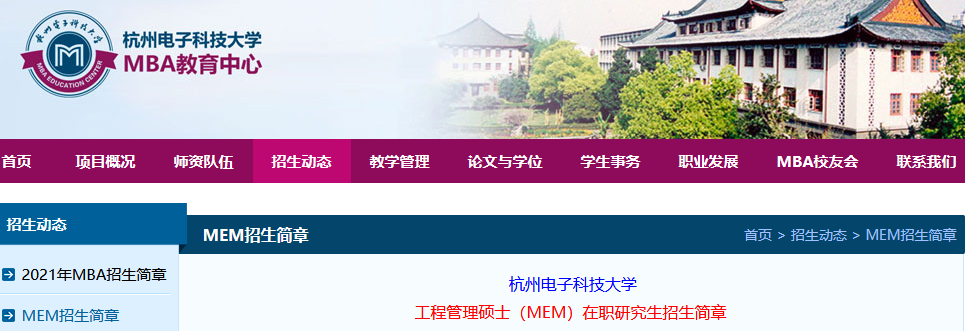 各大院校2021年碩士研究生招生簡章正在陸續(xù)公布!各大院校碩士研究生招生簡章為考生提供了院校招生計劃、報考條件、網(wǎng)上報名及現(xiàn)場確認、資格審查等重要信息。復習備考,信息至關重要!今天,小編整理了“2021MEM招生簡章|2021年杭州電子科技大學MEM招生簡章”的相關內容!有相關報考意愿的同學一定要及時關注!