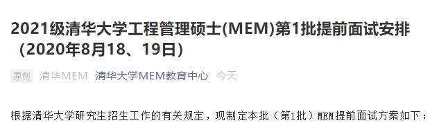 以上就是“2021年MEM提前面試 | 清華大學2021MEM第一批提前面試通知”的全部內容!更多考研信息持續更新,多多關注!祝考研順利,馬到成功!