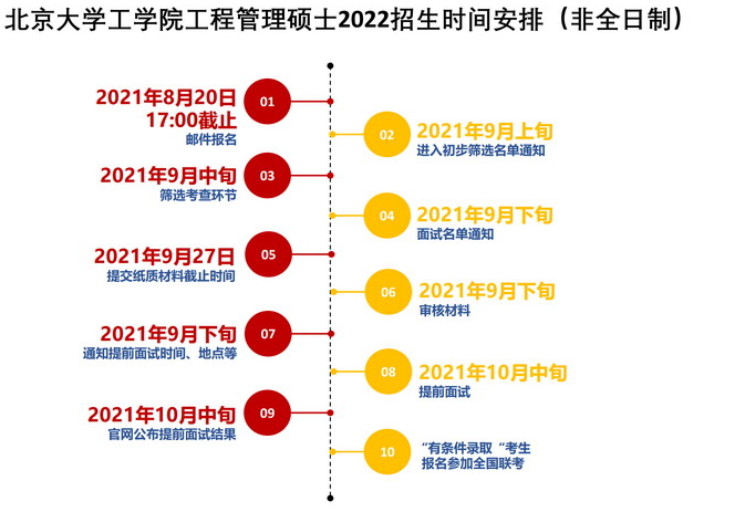 所有報考北京大學工學院工程管理碩士的考生,必須參加提前面試才可獲取報考資格,即未經提前面試而直接參加全國聯考者,無論成績高低均不予錄取。