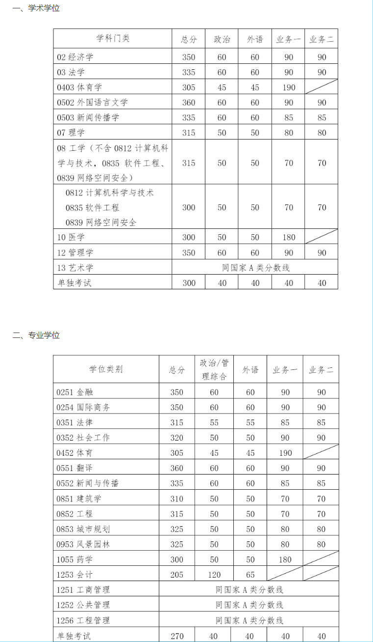 | 學(xué)位類(lèi)別 | 總分 | 政治 | 外語(yǔ) | 業(yè)務(wù)一 | 業(yè)務(wù)二 |