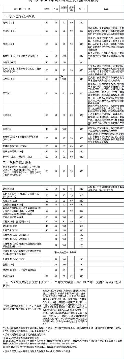 | 法學[03] | 55 | 55 | 90 | 90 | 345 | 法學院、知識產權研究院、南海研究院、人類學與民族學系、公共事務學院、馬克思主義學院、南洋研究院和臺灣研究院的學術型法學類專業執行此分數線 | ||