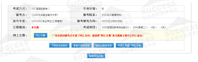 若此報考點開通了網上支付,您必須選擇網上交費來完成碩士研究生報名,否則此次報名數據無效!(如果您在本次交費過程中交易處理失敗,您可以在網上報名期間隨時登錄網上報名系統進行網上支付)