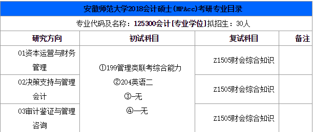 導讀:小編為考生整理了安徽師范大學2018會計碩士(MPAcc)考研專業目錄,僅供您參考!